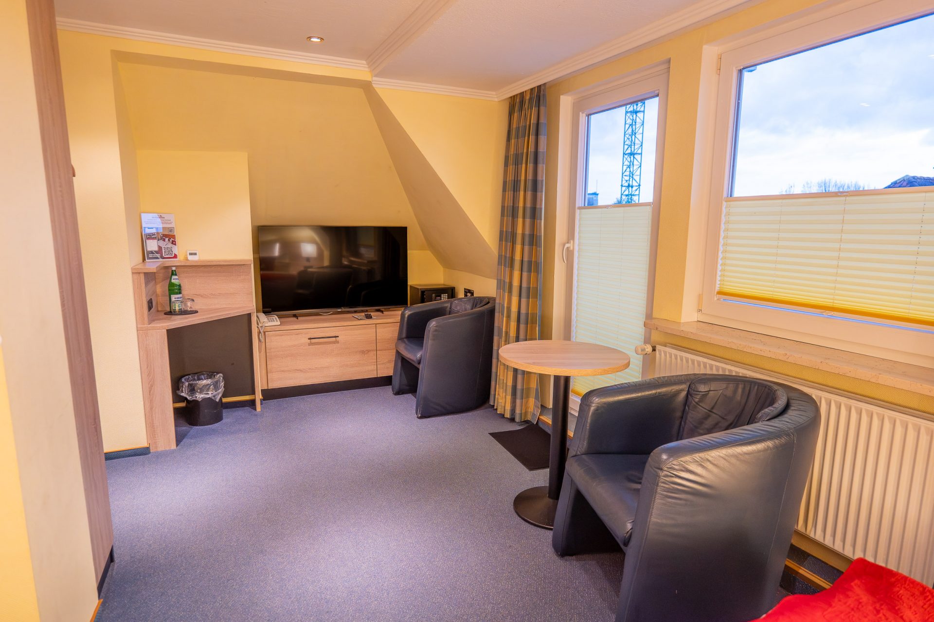 Das Doppelzimmer empfängt Sie mit einem hellen, gemütlichen Ambiente und bietet alles, was Sie für einen erholsamen Aufenthalt in Büsum benötigen. Zur Ausstattung gehören ein komfortables Doppelbett, Flachbild-TV, Telefon, Radio und kostenfreies WLAN. Eine kleine Sitzgelegenheit lädt zum Entspannen ein. Im Bad finden Sie Dusche, WC und Föhn. Alle Zimmer sind Nichtraucherzimmer. Das Haus verfügt über keinen Aufzug.